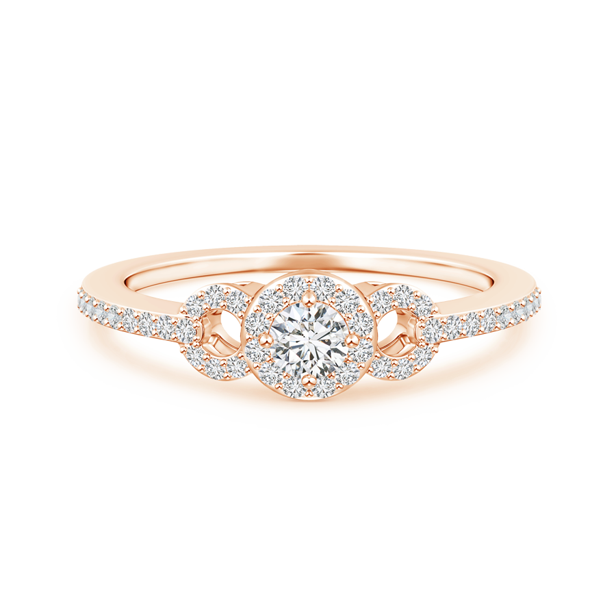 Impeccably crafted in 14k gold, this vintage style promise ring features three round diamond studded frames with a solitaire embedded in the central frame. For extra sparkle and grandeur, this lab grown diamond halo ring is flanked by a row of diamonds on each side of the shank.